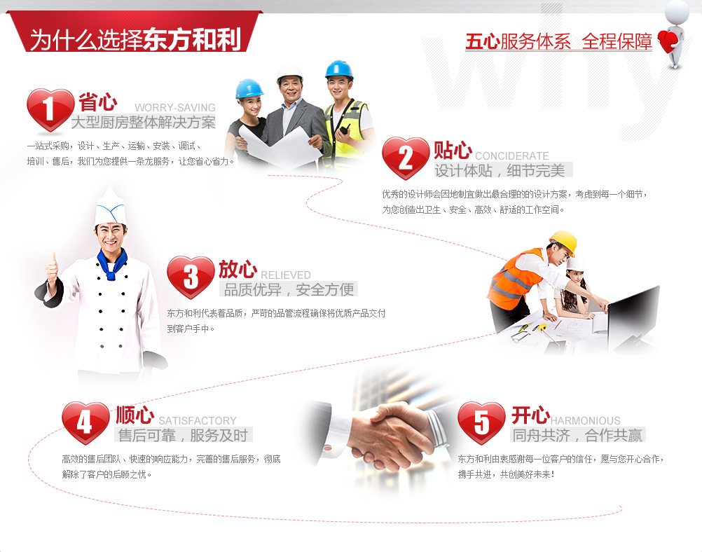 廚房工程建設(shè)是一項(xiàng)龐大復(fù)雜的系統(tǒng)工程,既需要與后勤工作人員、廚師溝通協(xié)調(diào), 又要與土建、裝修、機(jī)電、暖通等工程人員相互配合,工作量十分巨大。同時(shí)還要采購(gòu)眾多的食品機(jī)械、工具,這對(duì)沒(méi)有相關(guān)經(jīng)驗(yàn)的我們來(lái)說(shuō)確實(shí)是一個(gè)挑戰(zhàn)。有時(shí)候我們面對(duì)廚師提出的長(zhǎng)長(zhǎng)的采購(gòu)需求清單就已經(jīng)眼花繚亂了。 幸好東方和利提供的是整體解決方案,從前期的設(shè)計(jì)咨詢(xún)到后期的安裝調(diào)試、從大型設(shè)備到餐具小件,包括各種食品機(jī)械,排煙通風(fēng),這些瑣碎事情都由東方和利來(lái)完成,為我們提供量身定制的解決方案。一站式采購(gòu)為我們節(jié)省了大量精力,而且所有廚具都由東方和利來(lái)保修,對(duì)我們來(lái)說(shuō)也更加方便。總之,東方和利的服務(wù)讓我們非常省心,我很滿(mǎn)意。