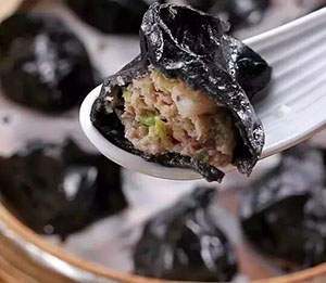 也是大連一帶流行的水餃。和面時加入了墨魚汁,面皮是黑色的;墨魚洗凈后切成塊剁成泥,朝一個方向攪動,直到粘性比較重時,加入五花肉泥繼續(xù)攪,最后加入韭菜、鹽等調(diào)制成餡。