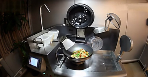 這是一款德國人發(fā)明的自動(dòng)炒菜機(jī)。可以根據(jù)菜品設(shè)定程序!淋油、加菜、翻炒,還能顛勺……連刷鍋都是自動(dòng)的……