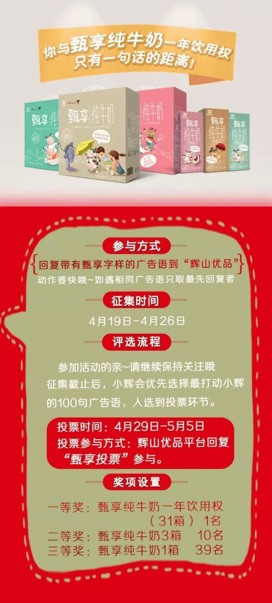 東方和利廚業(yè)的明星客戶「輝山乳業(yè)」的甄享純牛奶已經(jīng)上市啦!而且,為了讓這位新伙伴迅速圈粉,特面向小伙伴征集廣告語。一經(jīng)錄用,有大獎(jiǎng)等你哦!