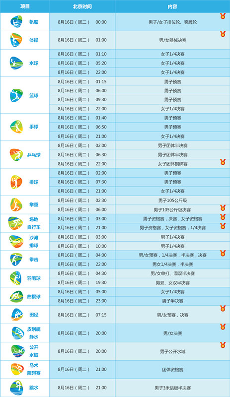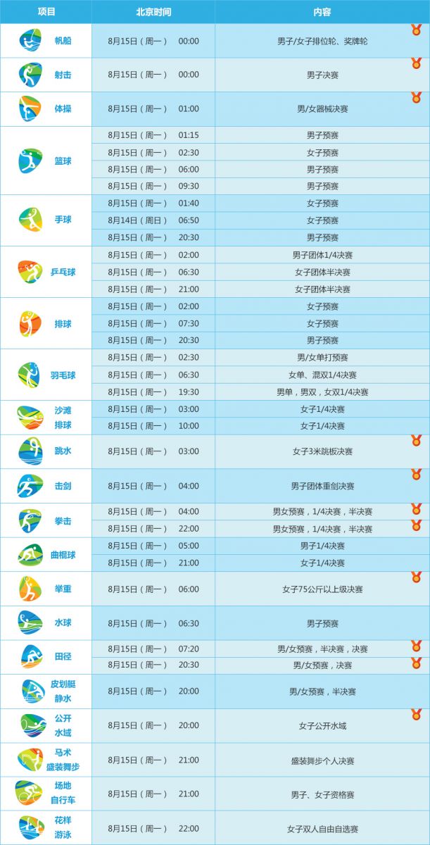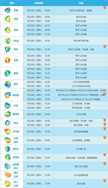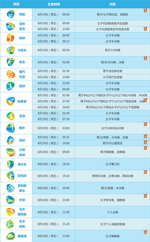 8月20日19點(diǎn)30分的羽球男單決賽,林丹有希望實(shí)現(xiàn)可怕的三連冠。而在3點(diǎn)30分,邱波和陳艾森將努力奪下男子10米跳臺(tái)的金牌。9點(diǎn)15分進(jìn)行女排決賽。