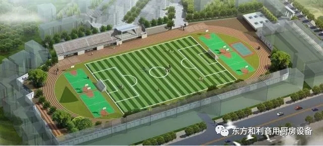 第二運動區(qū):一個標準足球場、一個容納15塊羽毛球場、兩個排球場、一個籃球場、30張乒乓球桌大型風雨操場。