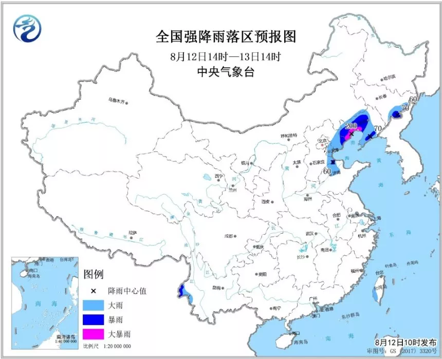 暴雨預(yù)報(bào):預(yù)計(jì),8月12日14時(shí)至13日14時(shí),山東西北部、河北東部、天津、遼寧中南部、吉林東部等地有大雨或暴雨,其中,遼寧西南部的部分地區(qū)有大暴雨(100~200毫米)。上述地區(qū)最大小時(shí)降雨量20~40毫米。