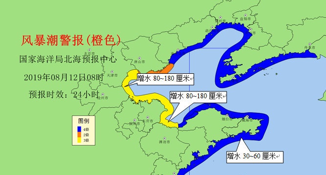 自然資源部北海預(yù)報(bào)中心官方微博發(fā)布風(fēng)暴潮預(yù)警,受今年第9號(hào)臺(tái)風(fēng)"利奇馬"(熱帶風(fēng)暴級(jí)別)影響,預(yù)計(jì)8月12日上午到13日上午,山東半島沿岸將出現(xiàn)30-60cm的風(fēng)暴增水,萊州灣和渤海灣沿岸將出現(xiàn)80-180cm的風(fēng)暴增水。曹妃甸和京唐港驗(yàn)潮站將出現(xiàn)達(dá)到當(dāng)?shù)爻壬涑蔽坏母叱蔽弧H坊港、黃河海港、濱州港、黃驊和塘沽驗(yàn)潮站將出現(xiàn)達(dá)到當(dāng)?shù)攸S色警戒潮位的高潮位,蓬萊、龍口和秦皇島驗(yàn)潮站將出現(xiàn)達(dá)到當(dāng)?shù)厮{(lán)色警戒潮位的高潮位。河北省唐山市預(yù)警級(jí)別為橙色,山東省濰坊市、東營(yíng)市和濱州市,河北省滄州市和天津市預(yù)警級(jí)別為黃色,山東省日照市、青島市、威海市和煙臺(tái)市,河北秦皇島市預(yù)警級(jí)別為藍(lán)色。