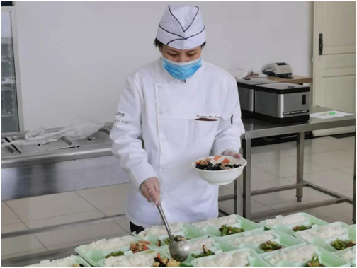 食品安全無小事,從原料采購到食品制作再到送餐,餐飲中心工作人員都嚴(yán)格遵守操作規(guī)程,每一環(huán)節(jié)都嚴(yán)格把關(guān),每一項(xiàng)工作領(lǐng)導(dǎo)都嚴(yán)格監(jiān)管。工作期間,全體工作人員佩戴帽子、口罩,從健康檢查、晨檢、洗消到留樣更是一絲一毫都不能馬虎。食物制作完成后,裝入外賣保溫箱中,由專人用消毒后的專車統(tǒng)一配送到送餐點(diǎn)。在未來學(xué)生陸續(xù)返校后,將繼續(xù)沿用錯峰就餐的分餐和送餐模式相結(jié)合的就餐方式。
