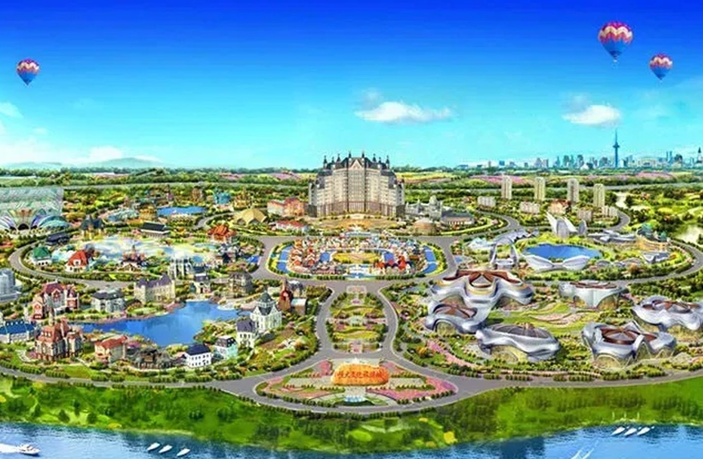 第五板塊為世界建筑文化酒店會議區(qū),包括世界各國特色風情酒店29座、中式貴賓樓Ⅰ型1座,國際會議中心1座。