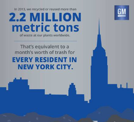 2013年,通用汽車的全球工廠回收再利用的廢棄物材料總量超過220萬噸。這些廢棄物能裝滿3800萬個完整的垃圾袋,而且它相當(dāng)于每個紐約居民在一個月產(chǎn)出的垃圾總和。