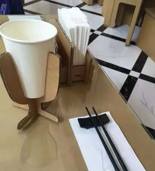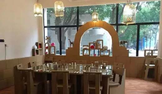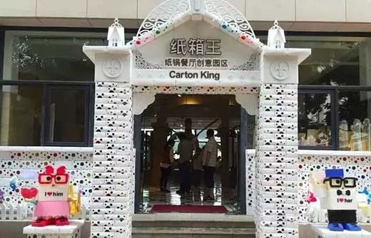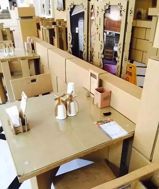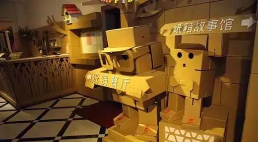 紙箱王的創(chuàng)意都是為了環(huán)保考慮,餐廳里所有的擺件都可以再回收利用。