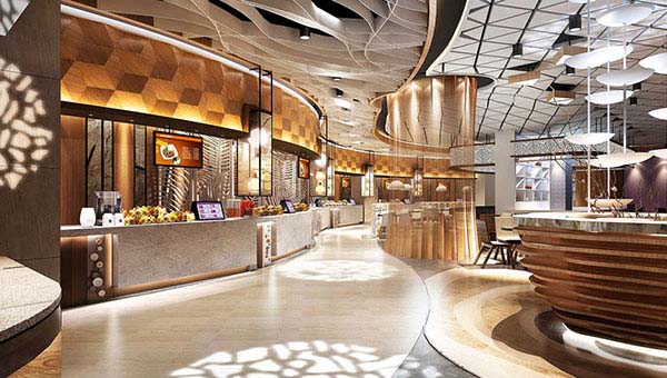美食廣場設(shè)計方案通常采取在大空間場地的周邊布置售賣柜臺和廚房,每家店鋪占用空間較小,店面寬為3-6米,進深為6-10米,每家店鋪需要配備排油煙設(shè)備及廚房后部運輸通道。隨著生活水平不斷提高,人們對食物口味的要求越來越高,因此食物的質(zhì)量是美食廣場每家店鋪競爭的關(guān)鍵,需要業(yè)主配備精良的廚房設(shè)備。