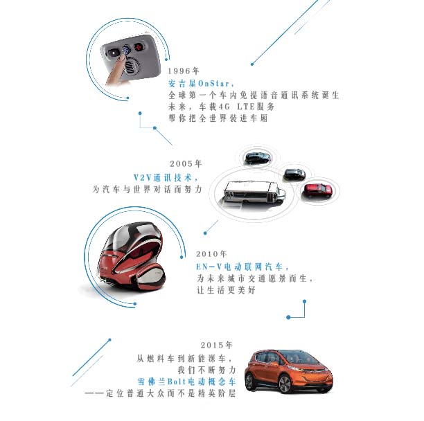 1996年全球第一個(gè)車(chē)內(nèi)免提語(yǔ)音通訊系統(tǒng)誕生;2005年,V2V通訊技術(shù),為汽車(chē)與世界對(duì)話而努力;2010年,EN-V電動(dòng)聯(lián)網(wǎng)汽車(chē),為未來(lái)城市交通遠(yuǎn)景而生;2015年,從燃料車(chē)到新能源車(chē),我們不斷努力。