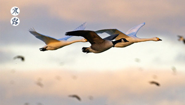 寒露分三候。一候,鴻雁來賓,時至寒露,鴻雁南遷。有種說法是賓同"濱",是水邊的意思,鴻雁都飛往江南水濱。