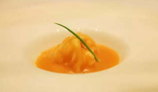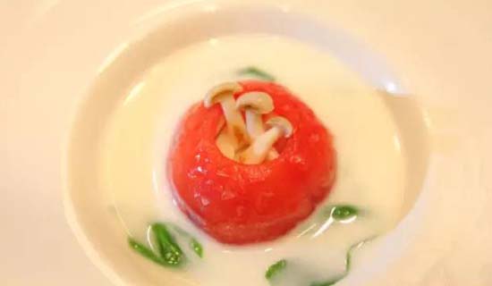 鮮魚(yú)汁十月紅 38元/位:意為"花好月圓",有著"金枝玉葉"美稱的白玉菇加上甜豆、面片、豆苗放入番茄中,番茄浸入魚(yú)湯,象征洞房春暖魚(yú)水情深。