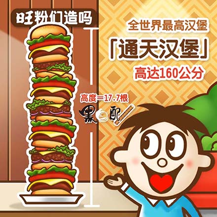 全世界目前最高的"通天漢堡"由某英國漢堡店老板制成!高160公分、比旺仔還高呢!這個漢堡排了10個芝士漢堡,每個都夾熏肉、肉醬、意大利面、香腸、肉丸、牛肉、色拉。高度嚇人,熱量更嚇人,高達(dá)3萬卡路里!