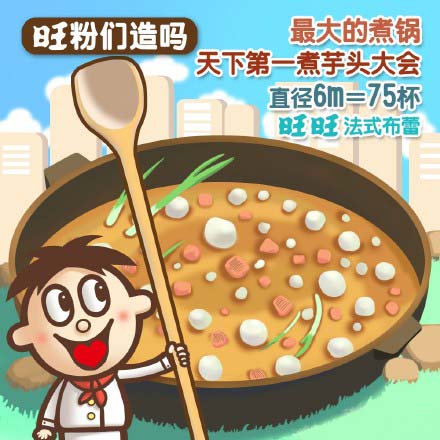 最大的煮鍋來自日本山形縣舉行的"天下第一煮芋頭大會",中間一架大鍋寬達(dá)6米,相當(dāng)于75杯旺旺法式布蕾的直徑!兩位師傅開著消毒后的挖掘機煮,一共使用3噸芋頭、1.2噸牛肉、3500根大蔥,供3萬人品嘗。