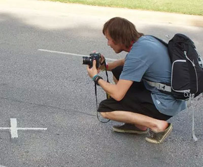 【舉例】這位趿拉著鞋的背包客正蹲在地上拍照。