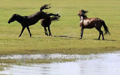 【釋義】騾馬等跳起來,用后腿向后踢。