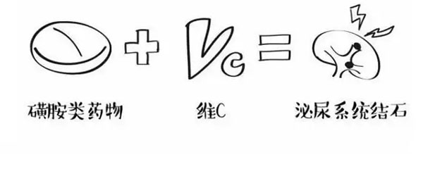 維生素C屬酸性物質(zhì),而磺胺類藥(如復(fù)方新諾明)及其代謝產(chǎn)物在酸性環(huán)境中易形成磺胺結(jié)晶鹽,而形成泌尿系統(tǒng)結(jié)石,導(dǎo)致腎臟損害。