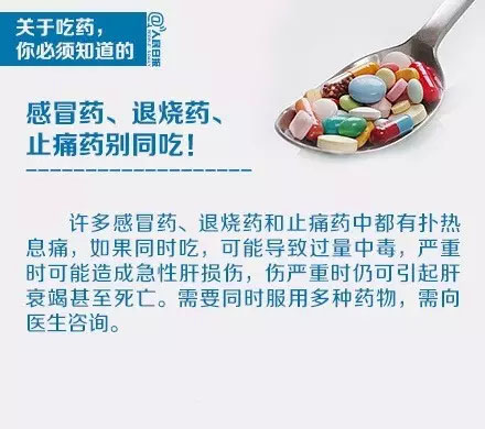 許多感冒藥、退燒藥和止痛藥中都有撲熱息痛(請仔細(xì)閱讀說明書)。如果同時使用兩種感冒藥,或同時吃退燒藥和止痛藥,造成撲熱息痛攝入過量,會造成急性肝損傷,嚴(yán)重會引起肝衰竭甚至死亡。