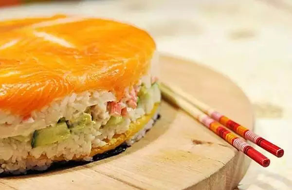 箱壽司又叫做笹壽司、木條壽司,主要流行于關(guān)西地區(qū),用小木箱(押箱)輔助制作壽司。先把配料鋪在押箱的最底層,再放上米飯,然后用力把箱的蓋子壓下去。作成的壽司會(huì)變成四方形,最后取出切成小塊。