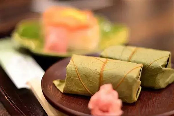柿葉壽司在奈良等地也有類似的壓制壽司,壽司上面的魚(yú)肉多是腌制的鯖魚(yú)或是鮭魚(yú),包裹上柿葉可以令壽司帶上清香,是非常有特色的壽司。