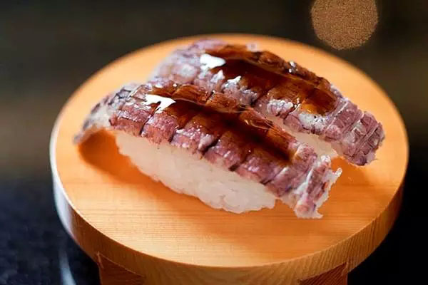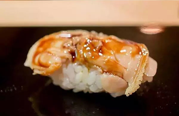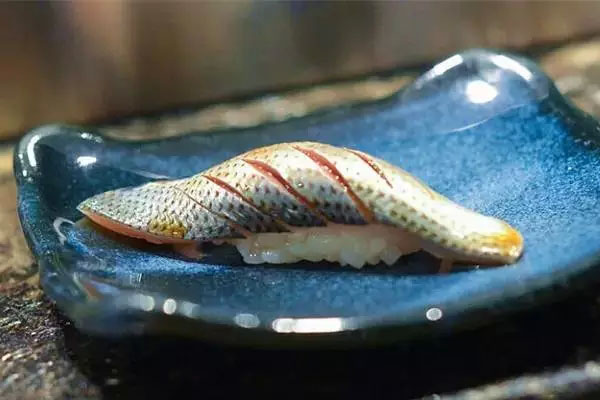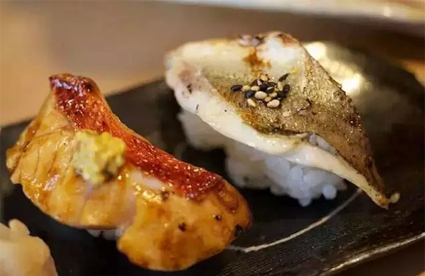 炙烤壽司,用噴槍對(duì)握壽司的食材進(jìn)行輕度的炙烤,給食材稍稍加熱的同時(shí),也可以讓一部分食材散發(fā)出脂類焦化和成熟后特有的香氣。通常在白身魚(yú)和青魚(yú)等脂類含量高的品種上選擇炙烤。
