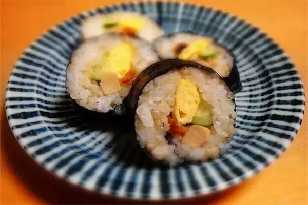 卷壽司,在小竹簾上面鋪一層烤海苔或紫菜,再鋪一層米飯,中間放上配料,卷起來(lái)成一長(zhǎng)卷,然后切成小段。細(xì)卷,顧名思義,就是比較細(xì)的壽司卷,通常只含一種配料。太卷,是直徑比較粗的一種卷壽司,通常包有數(shù)種配料。手卷,把壽司卷成圓錐體狀(類似甜筒),比較難用筷子挾,所以通常直接用手拿。